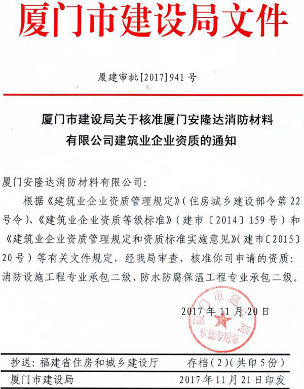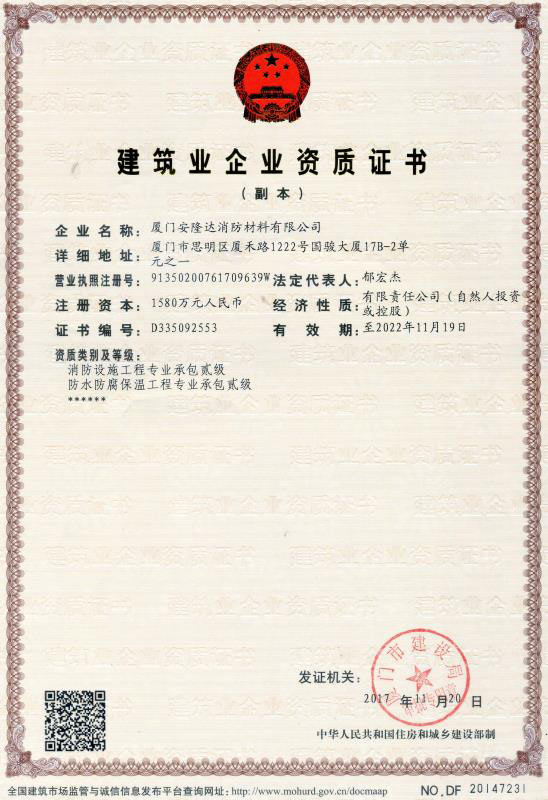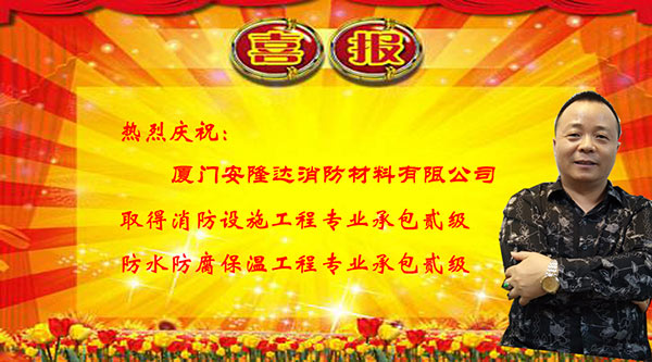 2017.11.28恭喜恭喜!廈門(mén)安隆達(dá)消防材料有限公司取得消防設(shè)施工程專業(yè)承包貳級(jí),以及防水防腐保溫工程專業(yè)承包貳級(jí)。